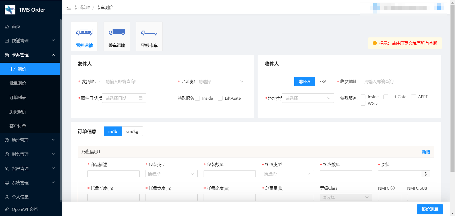 2.如果您需要零担运输(LTL)服务,点击之后按照表格填写您的货物信息以及收发地址,就可以进行报价测算了;如果需要整车运输(FTL)需要切换表单进行填写哦。